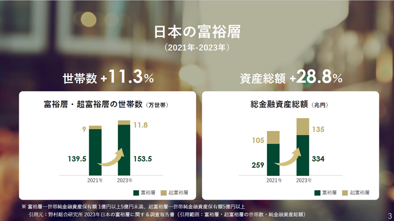 日本の富裕層は2021年の139.5万人から、2023年は153.5万人と拡大している。また、世帯純金融資産保有額5億円を超える超富裕層9万から11.8万と増えている。また、富裕層の総金融資産総額も高まっている。国内のキャッシュレス比率も拡大しており、年間支出2,000万円の人が21%から43%に増加すると、860万円がクレジットカードで支払われる。