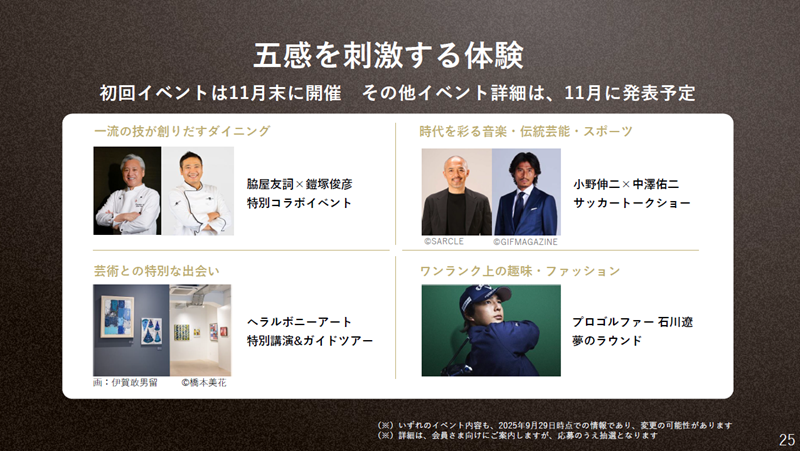また、小野伸二さん×中澤佑二さんサッカートークショー、歌舞伎町大歌舞伎特別鑑賞会などを予定している。さらに、会員限定の体験として、世界遺産仁和寺紅葉ライトアップ貸切拝観、プロゴルファーの石川遼さんとラウンドできる企画を行うという。初回のイベントは11月に開催するが、毎月複数回の開催を予定しており、幅広い会員層に対応していく(前述の内容は変更の可能性あり)。