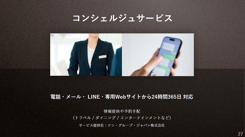 テン・グループ・ジャパンと連携したコンシェルジュサービスでは、トラベル/ ダイニング/ エンターテインメントなどの情報提供や予約手配を電話・メール・ LINE・専用Webサイトから24時間365日対応する。