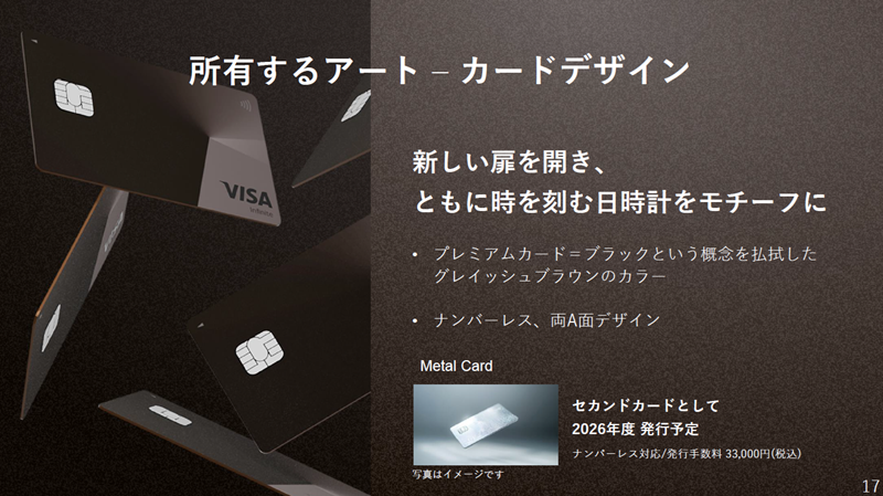 また、多様な体験価値を提供するという。グレイッシュブラウンのカードデザインはナンバーレスの両Aメンデザインであり、ブラックという概念を払拭したカラーとなるそうだ。また、セカンドカードとして2026年度に同社初のメタルカードを発行予定であり、発行手数料3万3,000円が別途必要となる。利用者の嗜好性に沿ったデザインを提供する予定だ。