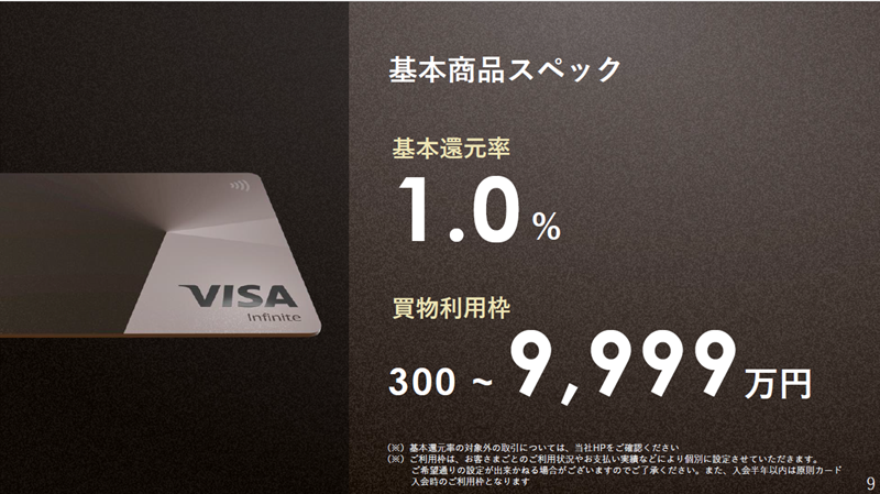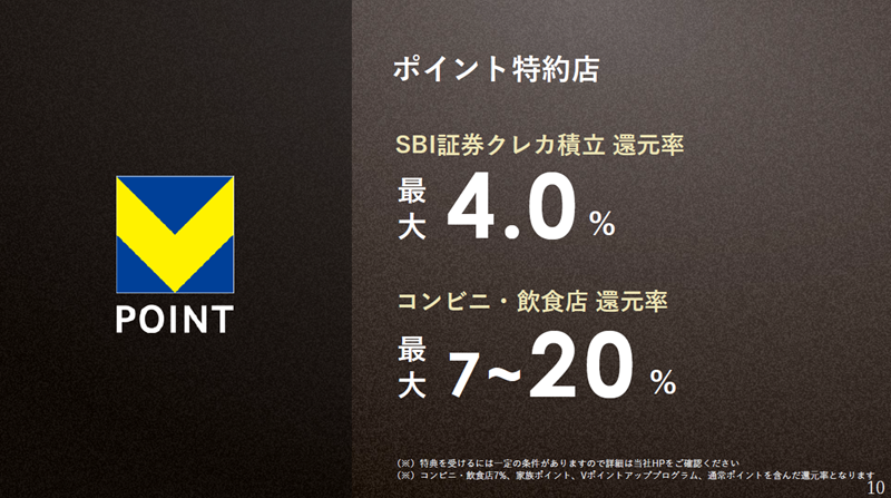 同カードは、基本還元率1%、買い物利用枠は300万から9,999万円となる。SBI証券のクレカ積立の還元率が最大4%、コンビニ・飲食還元率が最大7~20%となる。
