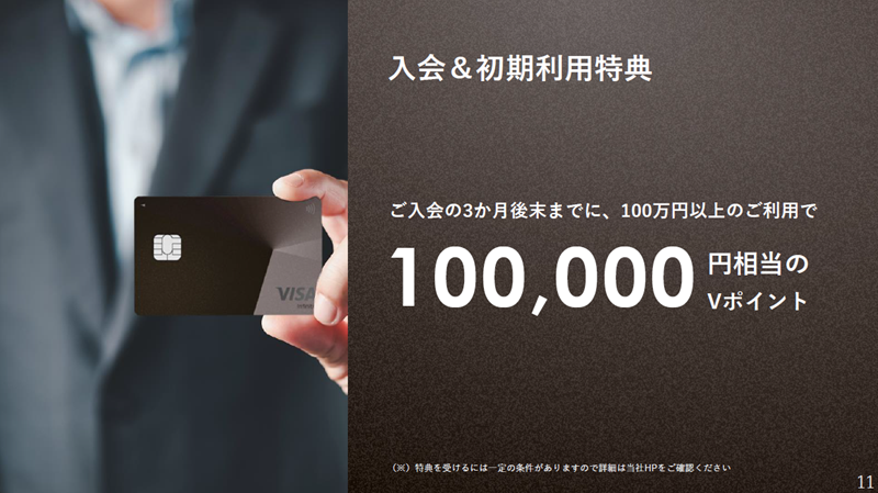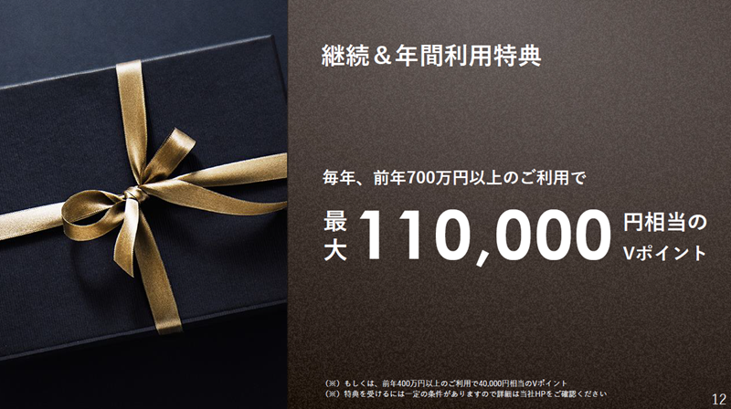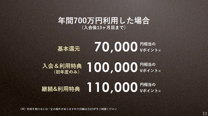 仮に700万円利用した場合、基本還元7万Vポイント、入会&利用特典10万Vポイント、継続&利用特典11万Vポイントが貯まるため、抜群の経済価値であると同社では自信を見せる。