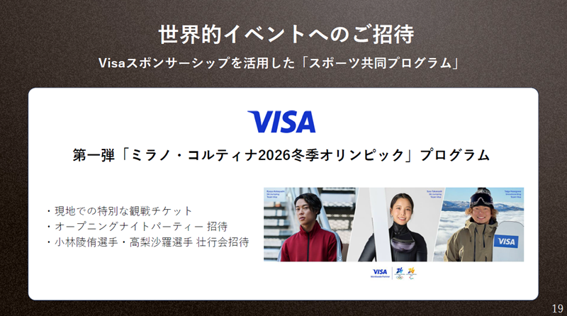 世界的イベントへの招待も実施。Visaと共同した第一弾として、「ミラノ・コルティナ2026冬季オリンピック」プログラムを行う。現地での特別な観戦チケット、オープニングナイトパーティ、壮行会招待などを行う。