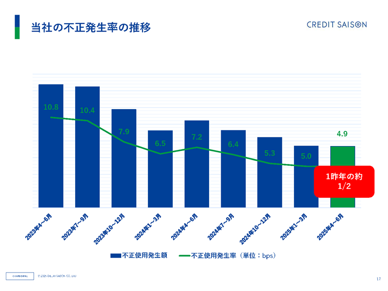 こういった取り組みも含め、同社の不正発生率は一昨年の約2分の1となった。カード取引が増える中、不正費用発生額も抑えられている。