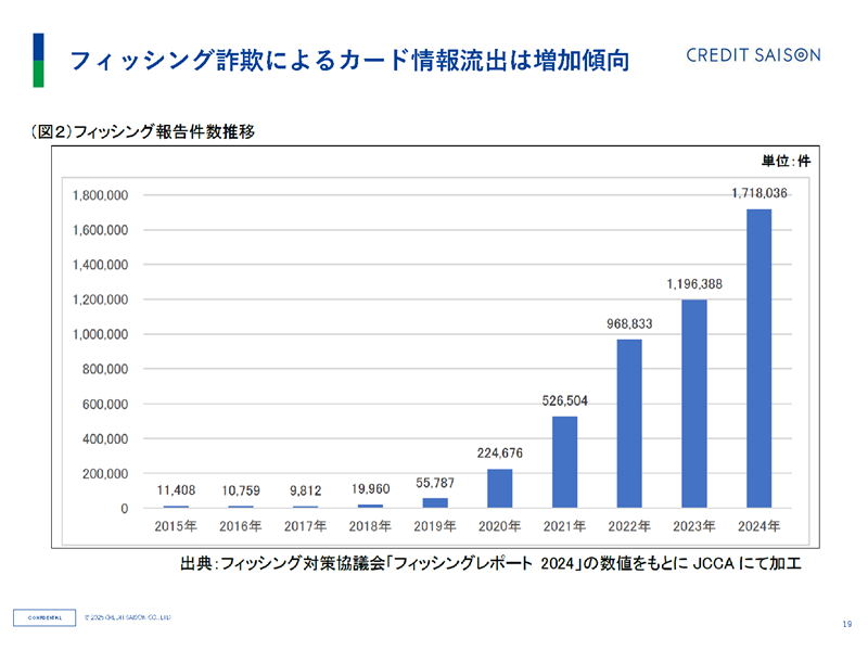 フィッシング詐欺によるカード情報流出は増加傾向だ。カード会社では各社のフィッシングサイトは自発的に閉鎖しているが、それ以外でフィッシング被害に遭っているサイトを撲滅させるための取り組みとして、クレディセゾンなどカード会社8社、日本クレジットカード協会(JCCA)、ACSiONと連携して取り組んでいる。フィッシングサイトが多く報告される企業や業界団体に対して、自社での自発的な閉鎖対応の要請や、閉鎖対応に必要なノウハウの提供などを通じて、閉鎖に取り組む環境整備を共同で呼びかけている。