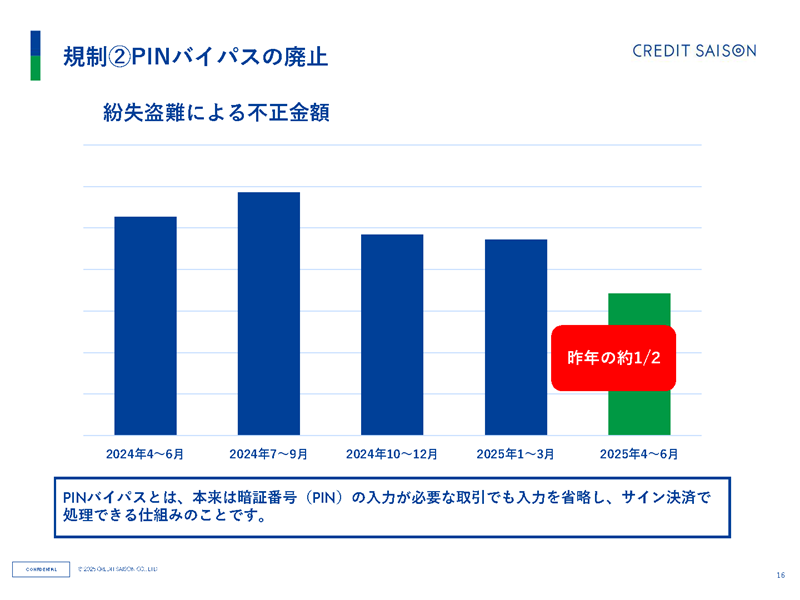 PINバイパスとは、本来は暗証番号(PIN)の入力が必要な取引でも入力を省略し、サイン決済で処理できる仕組みのことだ。今回の必須化により、第三者が暗証番号を入れないと使えないため、不正を抑制することができる。同社での2025年4月~6月の紛失盗難による不正金額は、前年同期比の2分の1となった。