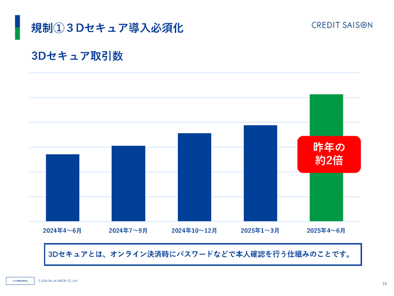 3-Dセキュアとは、オンライン決済時にパスワードなどで本人確認を行う仕組みのことだ。EC取引では、原則3-Dセキュアの導入が求められる。3-Dセキュアが必須化されたことにより、同社での2025年4~6月の3-Dセキュア取引数は前年の同時期に比べて2倍に伸びている。