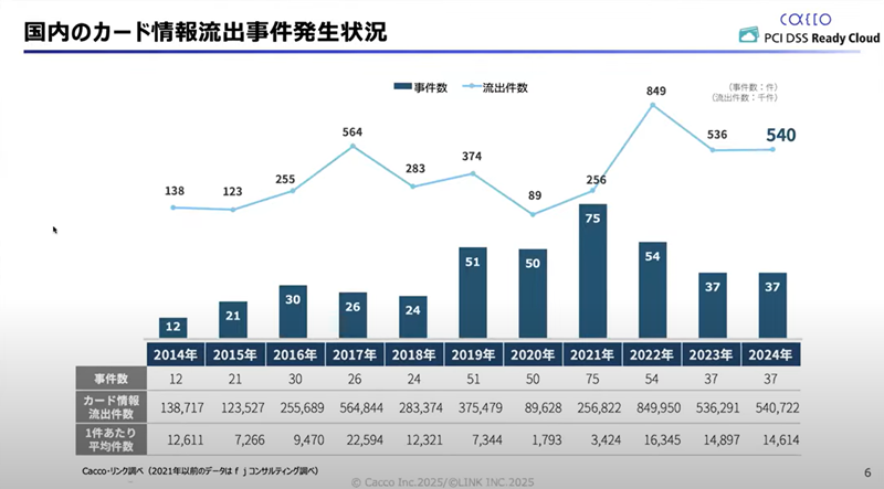 不正検知サービスを提供するかっこと、PCI DSS 準拠を促進するクラウドサービス 「PCI DSS Ready Cloud」などを提供するリンクは、クレジットカード情報流出事件に関する統計とECに関する不正利用傾向に関する年次版レポート「キャッシュレスセキュリティレポート2025(2025年10月発行)」を発表した。両社では、2025年9月29日に同レポートの解説やキャッシュレス不正利用の最新動向を紹介するメディア説明会を開催した。今回は2回に分けて、同説明会の内容を紹介する。