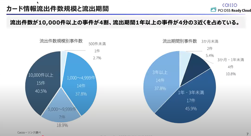 傾向をみると、カード流出件数が1万件以上の事件が約4割となり、流出期間1年以上の事件が4分の3近くを占めているそうだ。