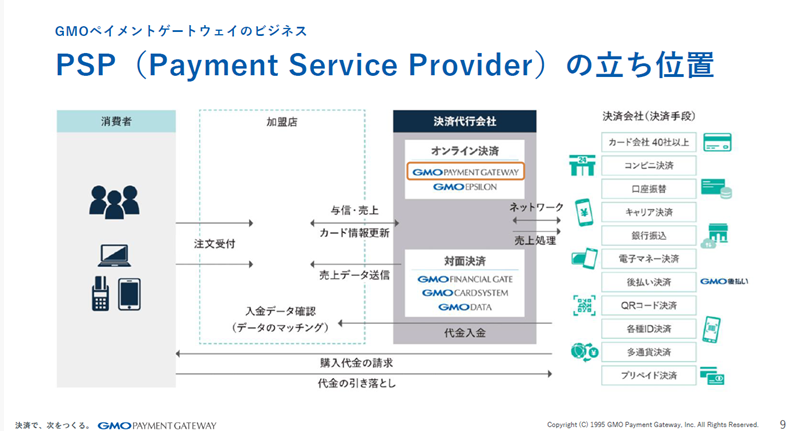 GMO-PGのビジネスはオンライン化、キャッシュレス化、DXを支援するビジネスを提供している。現在、メインの事業はペイメントサービスプロバイダとして加盟店と決済会社をつないでいる。PSPとして同社が間に入ることで、お金の流れ、加盟店の契約、そこをつなぐシステムの機能を果たしている。事業者への売り上げ最大化への貢献であり、「それこそがGMO-PGが提供する価値」であるとGMO-PG インダストリーソリューション本部 第1営業統括部ビジネス企画部部長 財津拓郎氏は話す。