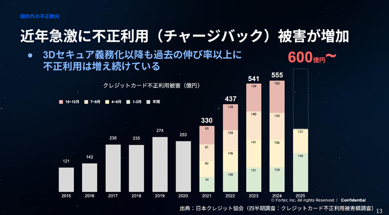 近年、国内でクレジットカードなどの不正利用被害が増えている。EMV 3-Dセキュア(3DS)の義務化以降も過去の伸び率以上に不正利用は増え続けており、2025年は600億円を超える可能性もある。