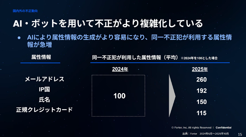 AIによってメールアドレス、IP国、氏名、正規クレジットカードといった属性情報の生成がより容易となり、2025年は同一不正犯が利用する属性情報が急増している。