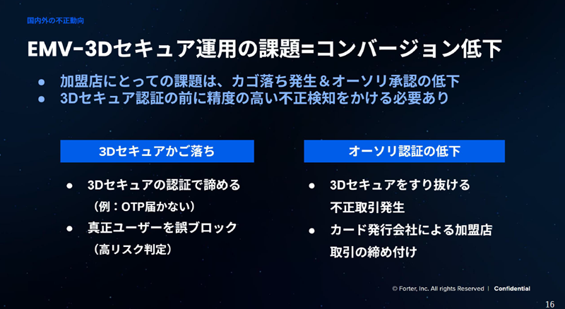 Forter日本担当カントリーマネージャ 野田 陽介氏は「3DSのすり抜けが起きており、カード発行会社は不正が多い加盟店に対して取引を制限することで、承認率が悪くなる現状が起きています」と話す。これにより、真正な取引が阻害されるケースも出てきているそうだ。