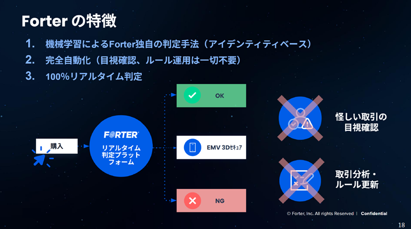 グローバルでビジネスを展開するForterでは、2023年の創業以来、機械学習を使った不正検知サービス「Forter」を提供している。18億人を超えるアイデンティティデータと30万超の事業者における年間約50億兆円の取引データから、AIによる完全自動化でのリアルタイム判断で、より多くの不正行為をブロックしているという。目視確認、ルール運用は一切不要で、100%リアルタイム判定となるそうだ。