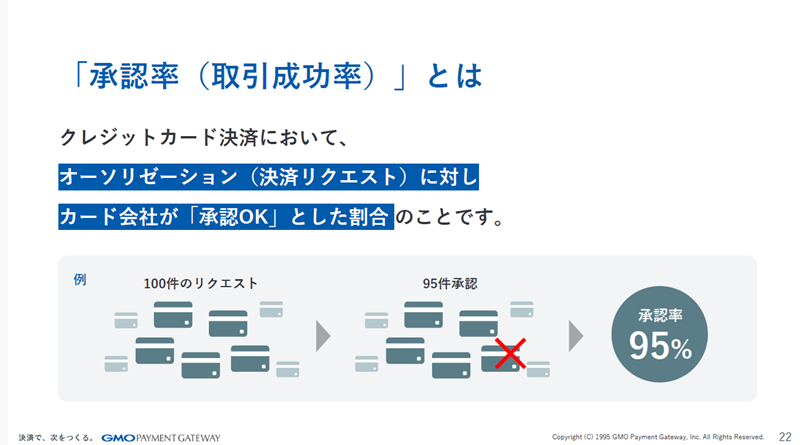 「承認率」は、クレジットカード決済において、オーソリゼーション(決済リクエスト)に対しカード会社が「承認OK」とした割合だ。例えば、100件の決済で95回の取引が成功した場合、承認率は95%となる。