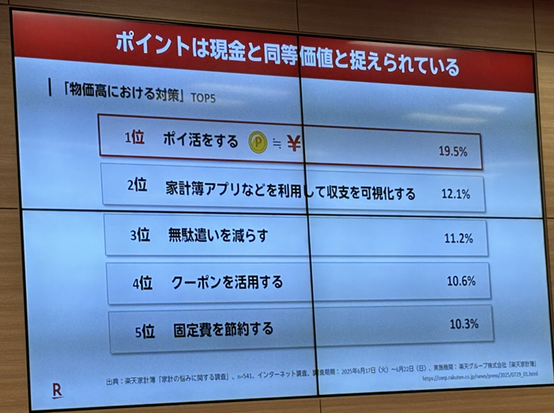 楽天提供の家計管理アプリ「楽天家計簿」が 2025 年 6 月に実施した「家計の悩みに関する調査」では、物価高対策で「ポイ活をする」が19.5%と最も多い結果となった。