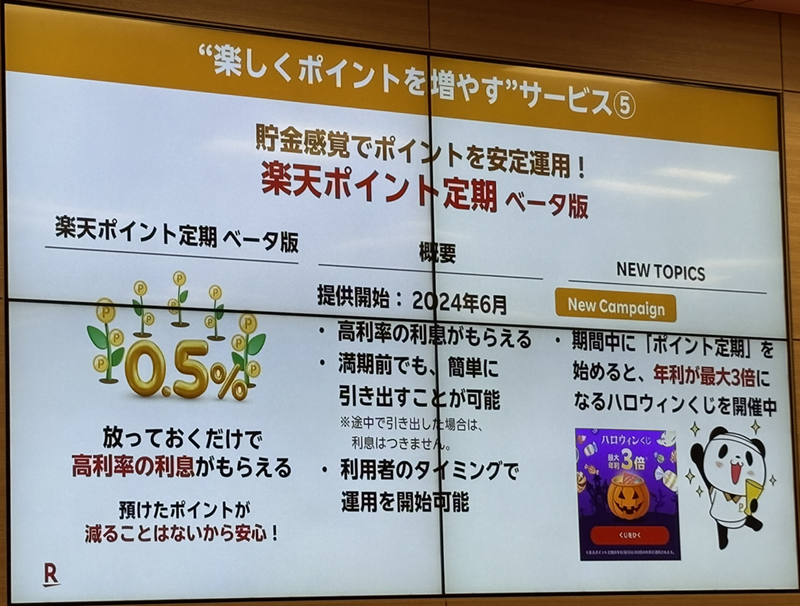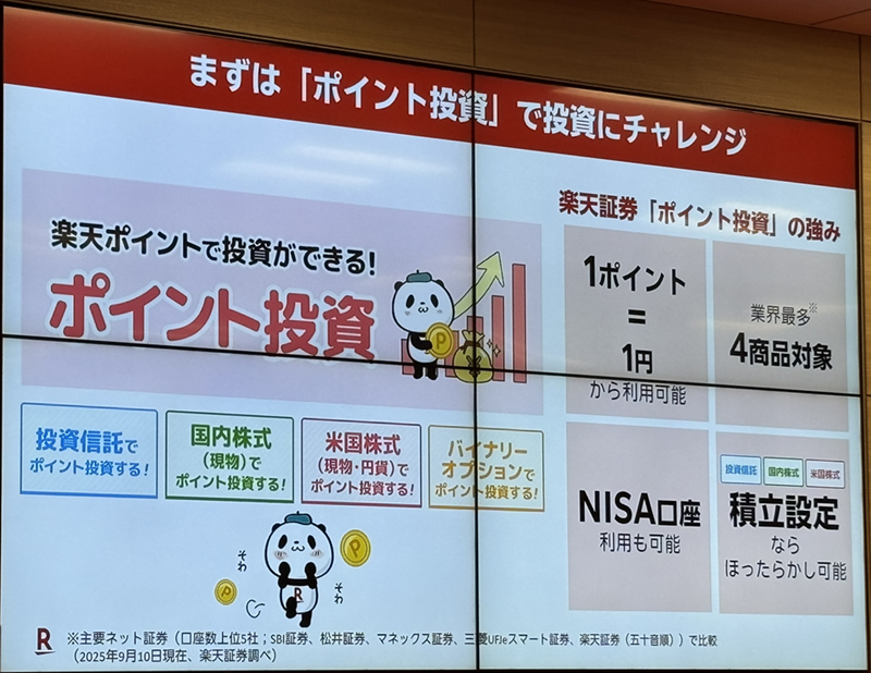 楽天グループと楽天証券は、2025年10月10日、ポイントを活用した資産形成をテーマに「楽天グループ ポイント運用・ポイント投資セミナー」を開催した。楽天グループでは、「楽天ポイント」公式アプリ「楽天PointClub」をリニューアルしたが、今後も「楽天ポイント」を「もらう」「増やす」「使う」を楽しめる新機能を追加していくそうだ。