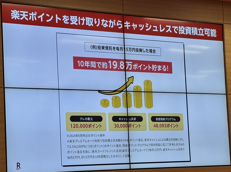 楽天証券では、楽天カードのクレジット決済で投資信託の積立額の0.5~2%をポイント還元。また、楽天キャッシュでも0.5%をポイント進呈している。例えば、楽天プレミアムカードで投資信託の積み立てを10年間した場合、19.8万ポイントが貯まるそうだ。
