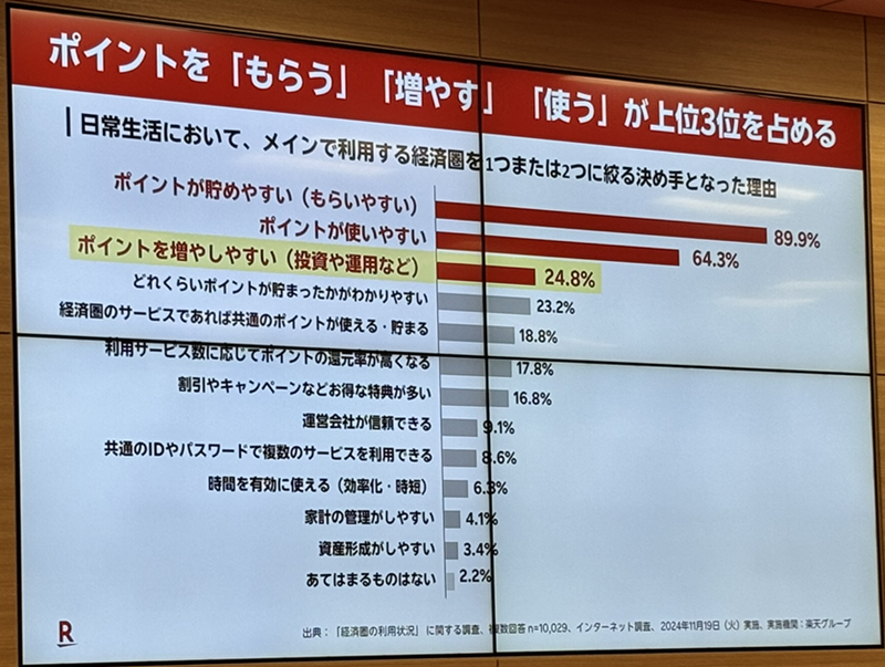 「ポイ活」は、買い物やキャンペーンなどで効率的にポイントを獲得する「もらう」、獲得したポイントを運用や投資に回して「増やす」、ポイントによる支払い充当や普段より良い体験・商品の購入に活用する「使う」という3つの要素で構成されている。複数のポイント経済圏が展開されている現代において、サービス利用を 1 つの経済圏に寄せることで、ポイントを「もらう」「増やす」「使う」というサイクルがより効率的になるとした。また、楽天が実施した経済圏の利用状況に関する調査でも、メインで利用する経済圏を絞る際、ポイントの「もらいやすさ」「使いやすさ」「増やしやすさ」が上位 3 位を占める結果となった。中でも3位の「いかに増やしていくか」が増えているそうだ。