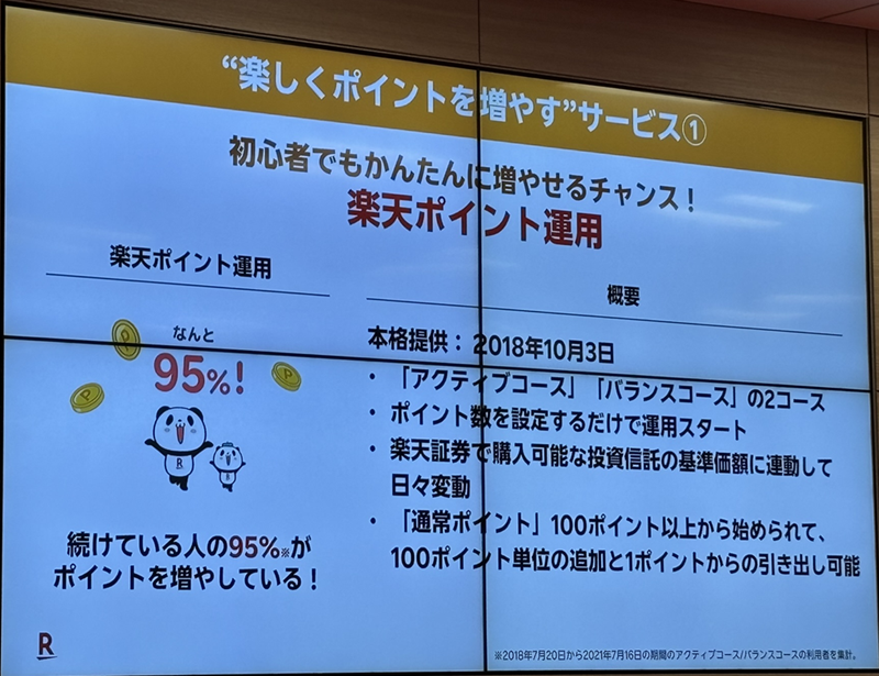 同部 船水美希氏は「楽天 PointClub」アプリのリニューアルについて紹介した。楽天では、「楽天ポイント」を増やすサービス・機能として、「楽天ポイント運用」「貯めトクモード」「ポイント楽天株」「楽天ポイントビットコイン」「楽天ポイント定期(ベータ版)」の 5 つのサービスおよび機能を展開している。