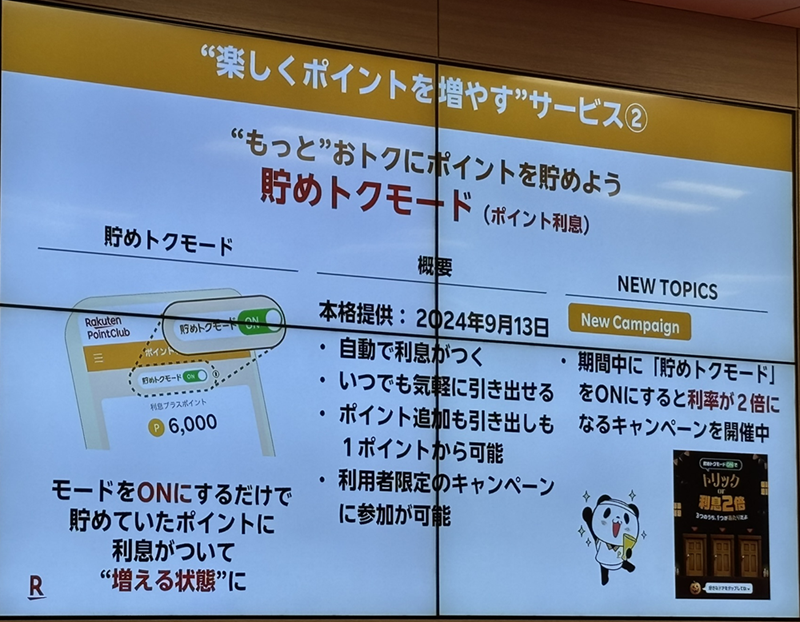 「貯めトクモード」は、ON にすると、貯めていた「楽天ポイント」に自動的に利息が付き、ポイントが増える状態になる。「楽天 PointClub」アプリ利用者のうち、約 6 割のユーザーが、「貯めトクモード」を ON にしている。