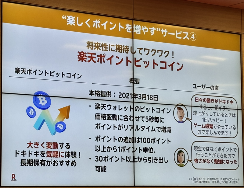 「楽天ポイントビットコイン」は、「楽天ポイント」を使ってビットコインの取引を疑似体験できるサービスだ。「楽天ウォレット」が提示するビットコインの取引価格に応じて、ユーザーのポイント残高が増減する。