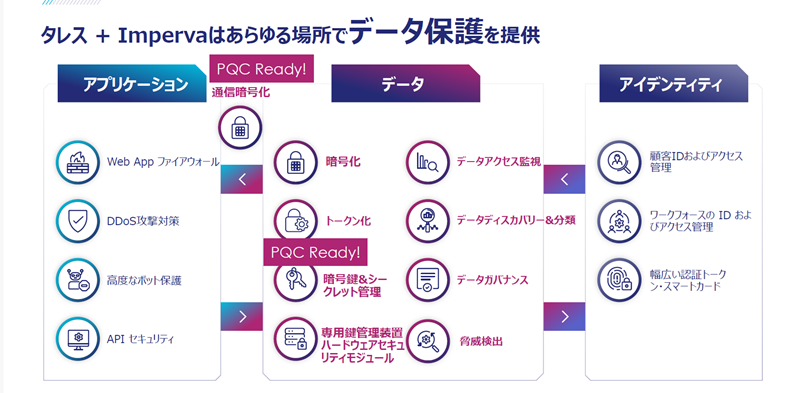 グローバルでサイバーセキュリティにコミットするという意思表示として、2023年にImpervaという会社を買収しました。これによりわれわれはデータの保護を、二要素認証、多要素認証のデバイスから、認証のクラウドサービスまで一気通貫で提供しております。誰かがアクセスするアプリケーションにはWeb Appファイアウォール、その経路であるネットワークにはDDoS対策、入り口の1つであるAPIにはAPIセキュリティ、そして最後にデータセキュリティと、一気通貫でデータを守る、世界トップ5のサイバーセキュリティ企業体となっております。