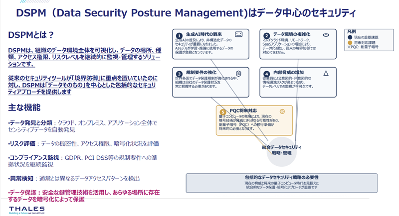 量子コンピュータの脅威に備えるPQC(耐量子暗号)の最新動向をご紹介。合わせて、タレスが描く未来のセキュリティアーキテクチャであるDSPM(データセキュリティポスチャ管理)について解説する。(2025年10月16日開催「ペイメント・セキュリティフォーラム2025 fall」の講演より)