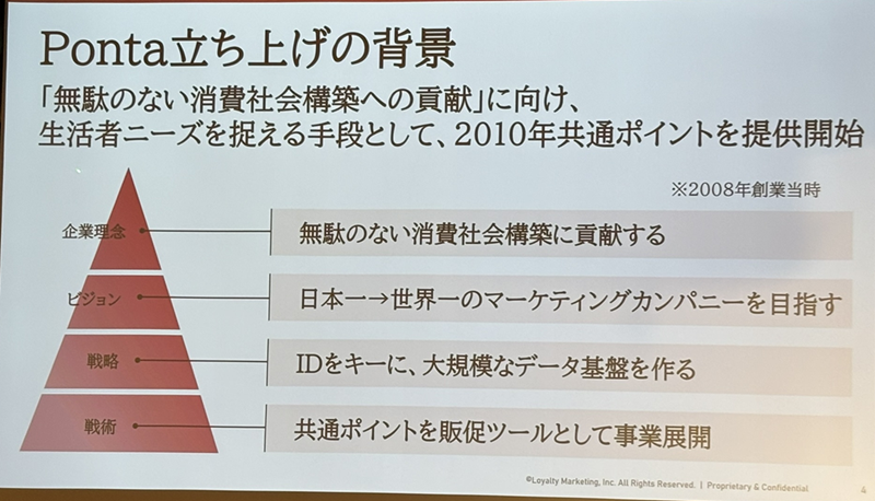 同社は2008年の創業当時から企業理念として、「無駄のない消費社会の構築に貢献する」を掲げてきた。生活者ニーズをとらえる手段として、2010年に共通ポイント「Ponta」を提供開始している。