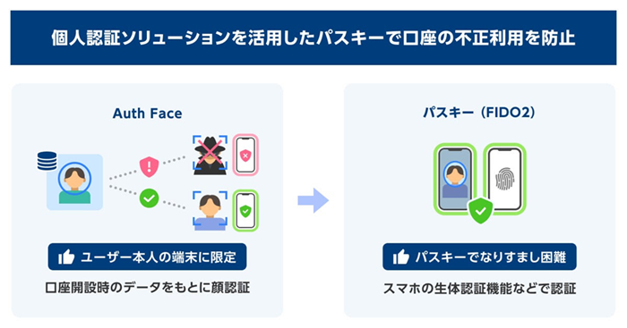 今回の仕組みでは、口座開設時、マイナンバーカードのICチップと顔撮影による本人確認(「JPKI+(容貌)」)で、偽造書類などによる申請を防止する。また、パスキーの端末登録では、顔認証でサービスを利用する端末をユーザー本人の端末に限定(バインディング)する。さらに、サービス利用時、パスキー(生体認証など)でログイン時のなりすまし不正を防止するという。これにより、口座開設時から日常の利用に至るまで、一貫した当人性の担保と不正利用の防止を実現するとしている。