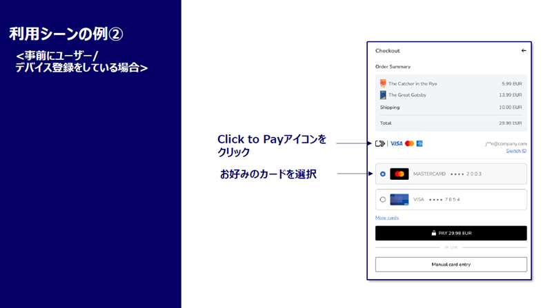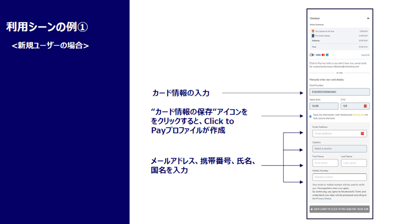 そのカード登録について一つの例を挙げさせて頂きますと、新規のユーザーは、決済画面で、カード情報を入力します。そして「カード情報の保存」をクリックすると、Click to Payプロファイルが作成されます。続いてメールアドレス、携帯電話番号、氏名、国名などの情報を入力すると、その情報が登録されて、以後、同じ情報を入力する必要はなくなります。次回以降は決済の場面でユーザーがClick to Payのアイコンをクリックすると登録したカードのリストが表示されるので、その中から使いたいカードを選んで、購入ボタンを押せば、決済が完了します。