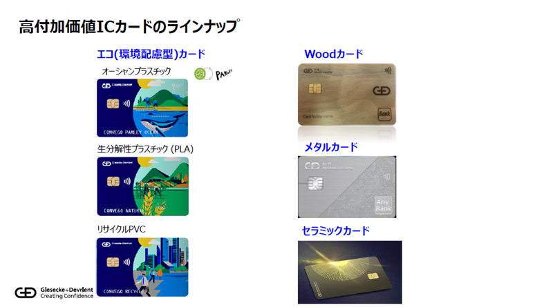 日本でも最近目にするようになってきたエコカードのラインナップを、グローバルで展開しております。海洋廃棄されたプラスチックを使ったオーシャンプラスチックのカード。これはNGOのパーレイというところとのコラボレーションで提供しています。それから土に返るPLAという素材、生分解性プラスチックを使ったカード。リサイクルPVCを使ったカードもグローバルで展開しています。