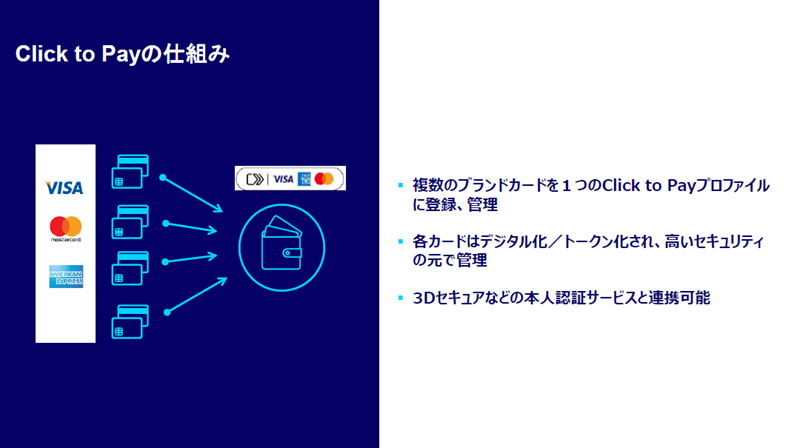 Click to Payには、さまざまな呼び方があります。SRC(Secure Remote Commerce)と呼ばれることもあれば、Click to Payと呼ばれることもある。Visaではクリック決済と名前を付けられました。これらは皆、同じものだと考えていただいてよいと思います。