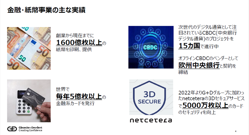 紙幣の印刷に関しましては、創業から現在までに1,600億枚以上を提供いたしました。デジタルソリューションとしてはCBDC、中央銀行デジタル通貨があります。われわれは紙幣をつくっているということでもともと各国の中央銀行と取引がありますので、現在15カ国とのプロジェクトが進行中です。また直近、10月2日には、欧州中央銀行とオフラインのCBDC(デジタルユーロ)のベンダーとして契約を締結したことが発表されました。