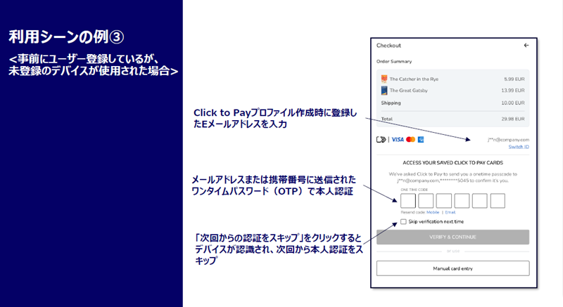 Click to Payはデバイス情報と関連付けられているために、事前にユーザー登録を済ませているユーザーでも、異なるデバイスからアクセスした場合には、もう1つ、認証のプロセスが発生します。一例になりますが、Click to Payのアイコンをクリックした後、プロファイル作成時に入力したEメールアドレスを入力し、そのアドレスに届いたワンタイムパスワードを入力することで認証が完了します。「次回から認証をスキップ」にチェックを入れると、今回使ったデバイスも登録されるので、次回以降はよりシンプルなかたちで決済ができるようになります。
