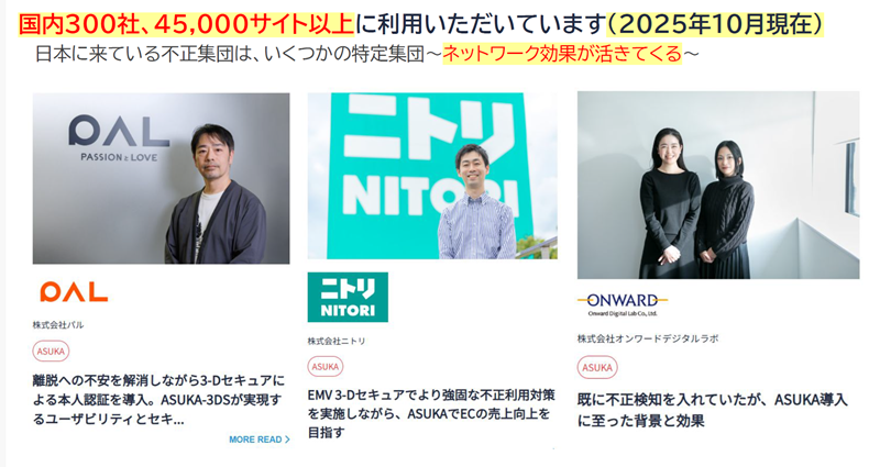 主力サービスとして、不正検知・認証システム「ASUKA」があります。2025年10月現在、国内300社、4万5,000サイト以上で利用していただいております。累積ではなく、今現在、これだけのサイトで使っていただいていますので、おそらく国内最大級のネットワークを形成しているものと考えております。