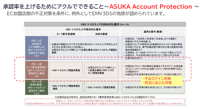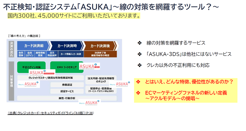 では、3DSはどうでしょうか。3DSには、住所の不正検知や名寄せ機能はありません。しかしこれも重要な機能であり、「ASUKA」は3DSもカバーしています。2024年にこのセミナーに登壇させていただいたときに、「ASUKA-3DS」というサービスを案内させていただきました。標準の3DSがあるのに、どうしてアクルが3DSのサービスを提供するのかと皆様キョトンとしていらっしゃって、あまり受けが良くなかったのですけれども。「ASUKA-3DS」も線の考え方に基づいたサービスであり、他社にはないサービスです。後ほどこれについても説明させていただければと思います。