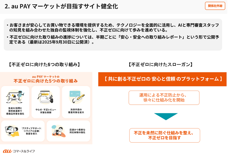 そういった状況の中で「au PAY マーケット」がどうやってサイトの健全化を目指すのかというところで、われわれは不正ゼロに向けた5つの取り組みを推進しています。