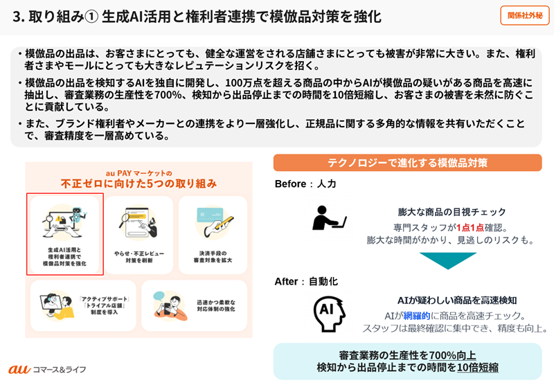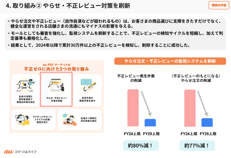 これについては今モールで、AIといえるレベルのものではないのですが、監視システムを刷新して、機械的に検知して削除する施策を行っています。削除の基準も以前よりかなり厳しく設定し直しました。2024年以降、30万件以上の不正レビューを検知、削除。不正レビューの発生件数は前年比で80%減少。不正レビューをするには不正注文をしなければならないわけですが、不正注文も同じように80%削減しております。以前はやらせ注文は前払いの銀行振込が多かったのですが、最近は堂々とクレジットカードを使うようなケースも増えていますので、そのあたりにも注目して不正対策を進めているところです。