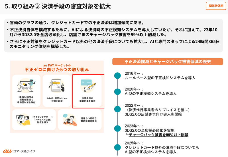 以前から不正決済を撲滅するという観点で、AIによる決済時の不正検知システムを導入していたのですが、これに加えて「au PAY マーケット」に出店している店舗さまには、2023年10月から3DS 2.0の導入を必須化とさせていただきました。結果的に店舗さまのチャージバックを99%削減いたしました。99%といっても、チャージバックは非常に特殊な場合以外には発生しない状態になっていますので、ほぼ100%なくなったと考えていただいて問題ありません。