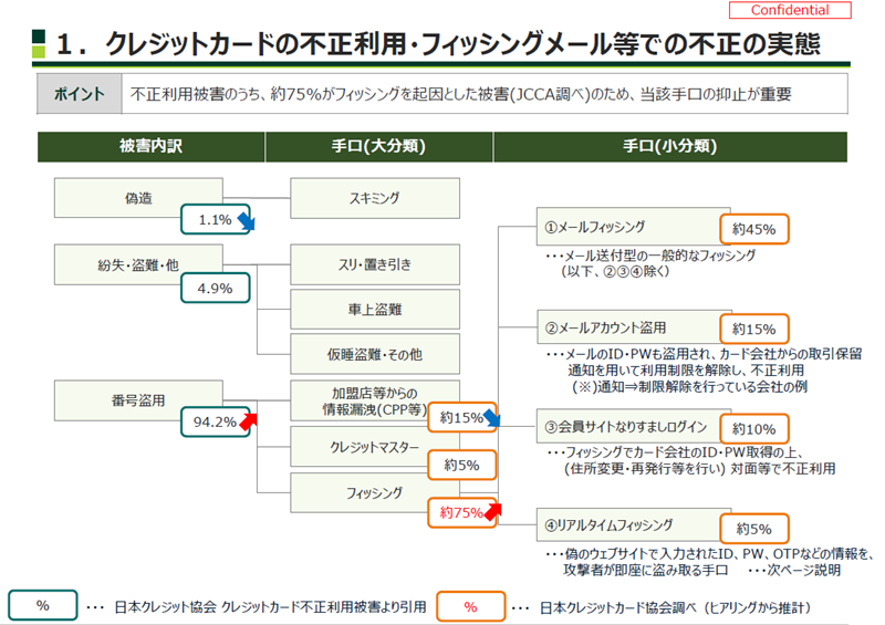 複数のカード会社にアンケートをとった結果わかったことは、過去には加盟店からの情報漏えい、クレジットマスターなどが猛威をふるっていたのですが、現在、これらは合計約20%程度にとどまっておりまして、フィッシングの被害が75%を占めているという現状があります。