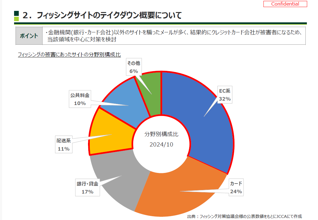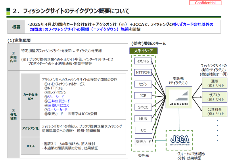今年、2025年4月から、イオンフィナンシャルサービス、NTTドコモ、クレディセゾン、ジェーシービー、三井住友カード、三菱UFJニコス、ユーシーカード、楽天カードの国内カード会社8社と共同して、ACSiONに委託して、複数のフィッシングサイトのテイクダウン(閉鎖)を実行しております。JCCAはこのスキームのオーナーとして、プロジェクトのとりまとめ、効果検証などを行っております。この取り組みはペイメントナビでも取り上げていただきましたし、NHK様、日経クロステック様にも取材していただきました。