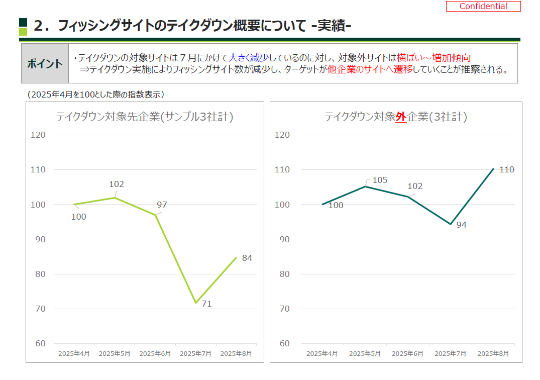 その実績はどうかといいますと、テイクダウン対象先の3サンプルの4月から8月までの5カ月間の状況では、スタート時の84%まで減少しています。一方、テイクダウンの対象外企業では同一期間で110%と増加しておりますので、対策の効果はあったと認識しております。ただフィッシングサイトは無数に存在しておりますので、引き続き対策を強化していくことが必要です。
