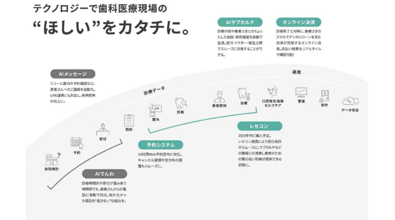 スマート決済は、診療終了と同時に、患者のスマートフォンでデンタルローンを含む決済が完結する。支払い結果もリアルタイムで確認することが可能だ。「医療機器を買い替えたい」というニーズや、開業を考えている歯科医師の支援を目指したリースサービスを展開し、キャッシュフロー改善にも貢献する。予約管理、医療費決済、AI電話などを統合し、情報管理から診察業務の大幅な効率化を実現しているという。