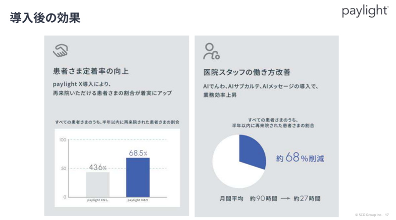 歯科医院向け運用オペレーションシステム「ペイライト・X」は、AIメッセージ機能で、リコール案内や予約確認など、患者への連絡を自動化した。LINE連携にも対応し、再来院率の向上を実現している。SCOグループ取締役社長兼代表執行役員COOの藤本公浩氏は「通院履歴や口腔内情報をもとに、メッセージをAIが作成・送信します。季節感や治療状況に寄り添う自然な文章です」と話す。