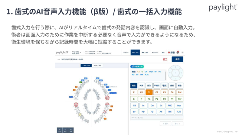 SCOグループは、2025年11月25日、歯科医師業界の慢性的な人材不足や業務負担の軽減を目的に、AIを活用した歯科医院向けオールインワンプラットフォームであるpaylight X(ペイライト・X)のアップデートを実装したと発表した。歯式のAI音声入力や画像管理、資料作成、会計処理など、歯科医院の日常業務におけるDXとキャッシュレス決済によって手作業の負担を軽減し、歯科医院の生産性と患者体験を同時に向上させるのが狙いだ。