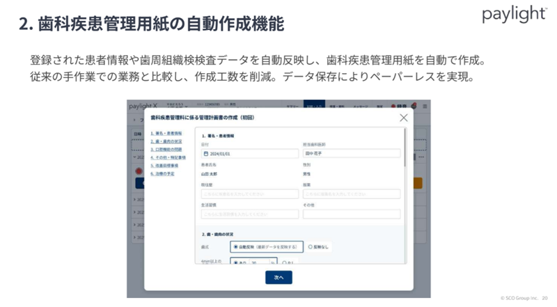 また、歯科疾患管理用紙の自動作成機能を搭載した。登録された患者情報などのデータを自動反映し、歯科疾患管理用紙を自動で作成する。従来の手作業での業務と比較し、作成工数を削減することが可能なほか、データ保存により、ペーパーレス化を進めることができる。