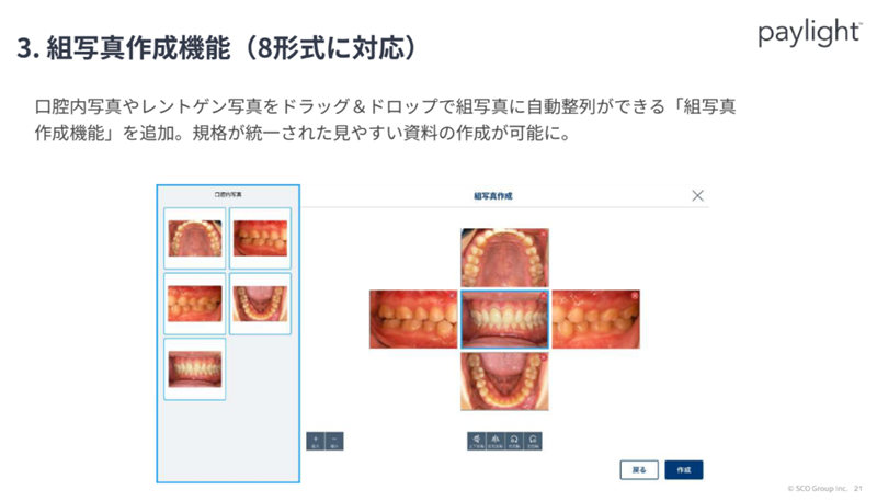 組写真作成機能は、口腔内写真やレントゲン写真をドラッグ&ドロップで組写真に自動整列することができる。これにより、規格が統一された見やすい資料の作成が可能になる。SCOグループは、「テクノロジーで『105年活きる』を創造する」をビジョンに掲げている。藤本氏は「歯科医師や歯科衛生士が本来の仕事に専念できる環境づくりを支援することで、予防歯科の普及に貢献していきたいです」と意欲を示した。