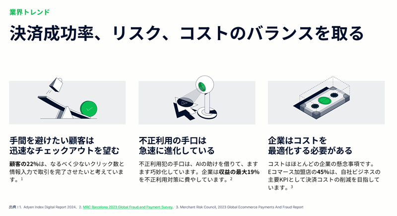 これは、ゲートウェイ、3DS認証、不正対策、アクワイアリングを一貫して自社で提供しているAdyenだからこそ実現できたソリューションだと自負しております。多くの場合、それぞれの機能は別々のプレイヤーが提供しており、必要最低限の情報だけが連携されています。Adyenはすべてを一貫してワンプラットフォームで提供します。これによって何か不具合が発生したときのトラブルシューティングが容易になるだけでなく、不正利用の最少化、決済成功率の最大化、コスト削減の3つの間で最適化を図ることを可能にするセットアップになっています。原因分析をしやすいので、適切な改善、改修につなげやすいという利点もあります。