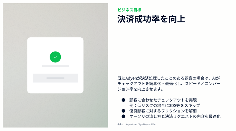 各項目についてもう少し詳しくご説明いたします。決済成功率の最大化に関してですが、Adyenで決済される取引は、90%の確率で、過去にAdyenのほかの加盟店で処理したことのある購入者のものだといわれています。それがお客様にとって初めて購入する加盟店であったとしても、既にどこかのAdyenの加盟店で取引をしている確率が90%だということです。
